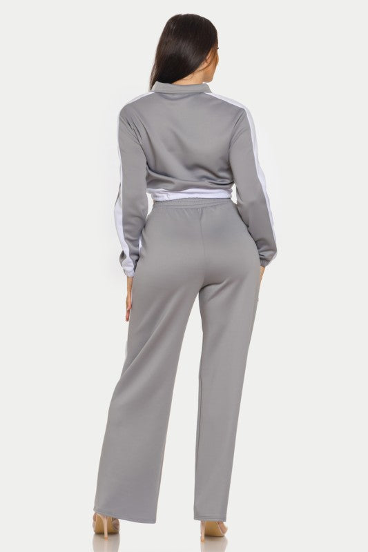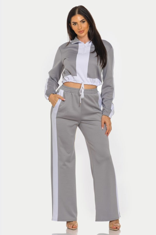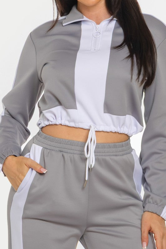 Effortlessly cool and street-chic, the City Luxe Track Set brings major fashion-forward energy to your off-duty days. Featuring a soft grey and white color-block design, this two-piece set includes a cropped quarter-zip pullover and matching drawstring pants with a relaxed straight-leg fit. Designed for comfort without compromising style, it’s perfect for travel days, errands, or casual nights out when you still want to look put-together.