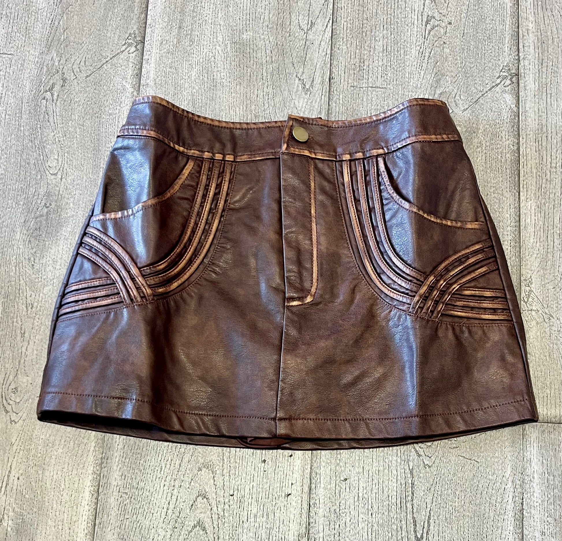 Unleash your inner edge with the Cognac Curve Mini Skirt, a fierce blend of fashion and function. Crafted in rich cognac faux leather with bold curved stitch detailing along the front, this piece gives vintage western vibes with a modern Flyy Girl twist. The high-waist fit flatters your curves, while the built-in shorts give you comfort and confidence to move freely — no matter the occasion.