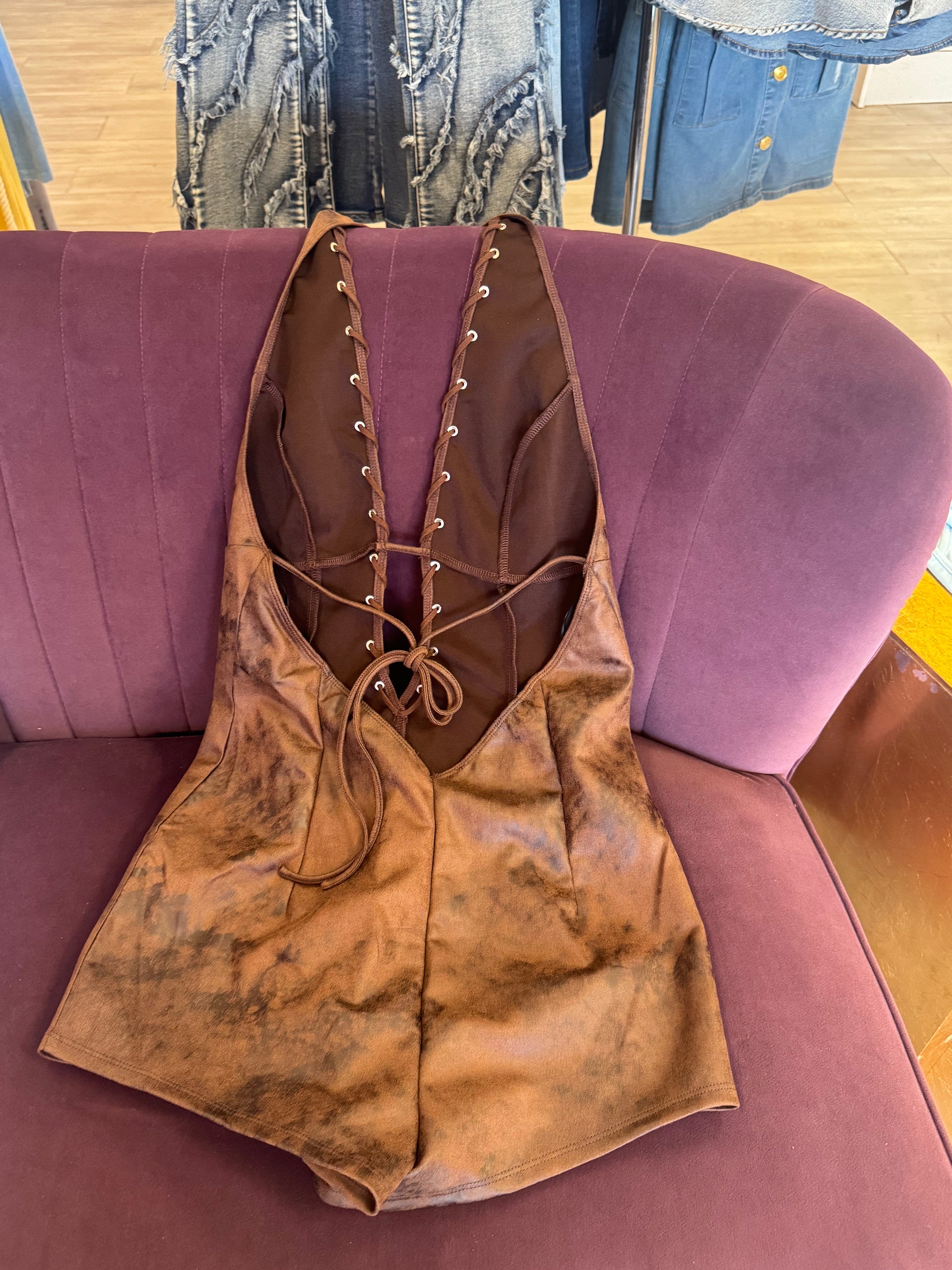 Crafted from a luxe suede-like stretch fabric, this romper delivers a rich, velvety feel with a flattering, body-hugging fit. The tie-back halter neckline and bold lace-up front create a sultry silhouette, while the open back adds just the right amount of drama.