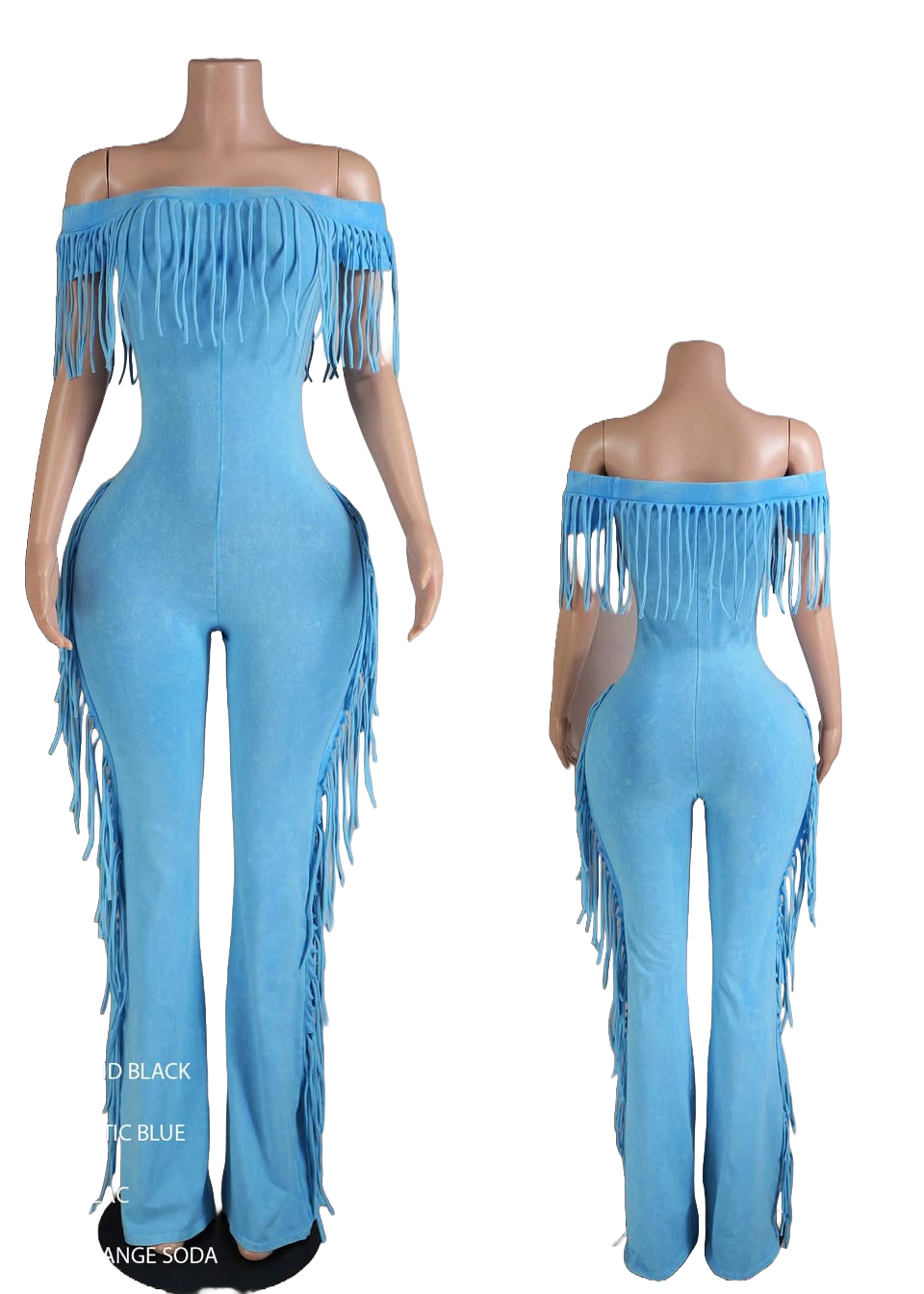 Turn heads and set trends in our Fringe Fever Jumpsuit. This off-the-shoulder, figure-hugging one-piece features bold side and sleeve fringe details that bring flirty drama to every step. Crafted in a soft mineral-wash fabric for a vintage-chic vibe, this jumpsuit delivers stretch, shape, and statement. Available in Acid Black and Arctic Blue—perfect for day parties, concerts, or late-night slayage.
