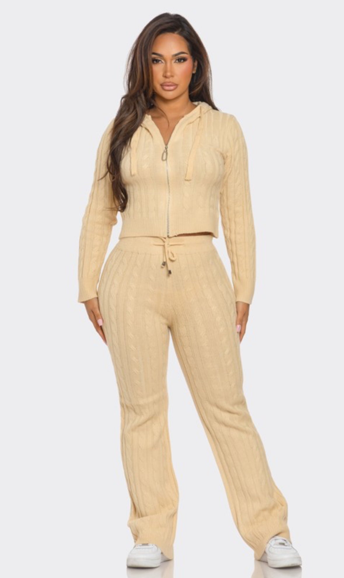 "Stay cozy and stylish with our "Way To Chill" pants set. This cable knit set features a high waisted design, elastic waistband for a comfortable fit, and a zipper front hooded sweater for added warmth. Perfect for lounging or running errands, this super stretchy set will become your new go-to outfit!"